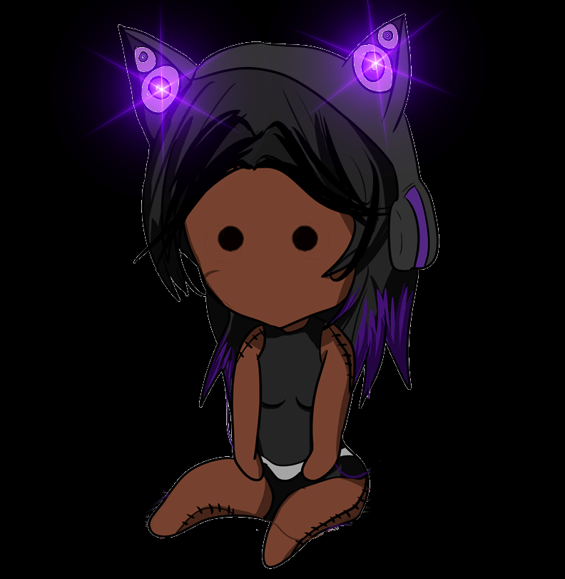 Viki is a darker skin doll (made after the woman it was designed after) The attire originally was lavender and dark purple with black hair, sometimes braided. This changed after Viki’s very first card reading which included the death card, which it was required to cause the recipient to die unexpectedly. After that, Viki’s colors turned black with only highlights of purple. Viki wears lighted headphones to accessorize but uses its ability to light up as a form of communication.